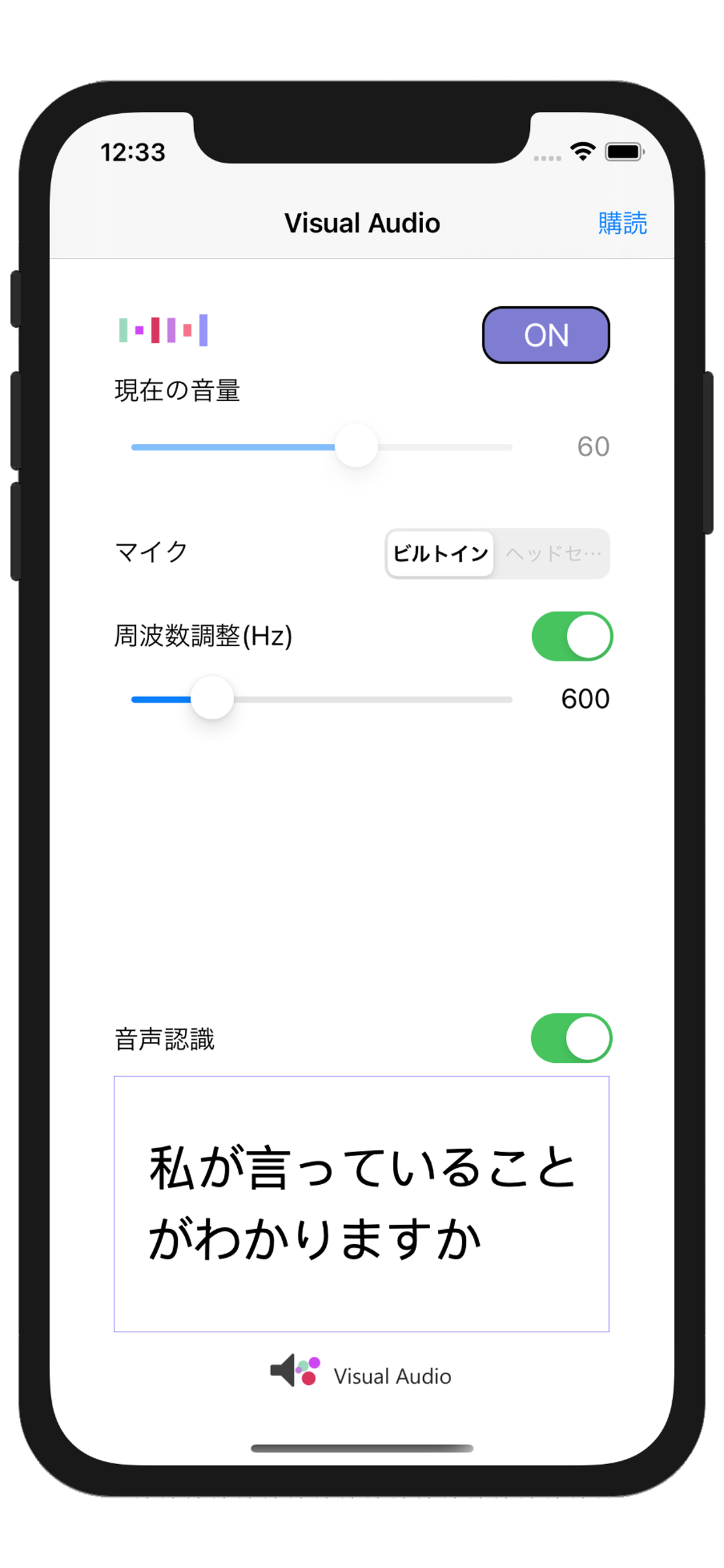 Visual Audio provides a number of ways to clearly audible the voice of others who are difficult to hear. - Adjust and amplify the audible audio frequency band that is different for each person. - Speech recognition that displays the voice of another per